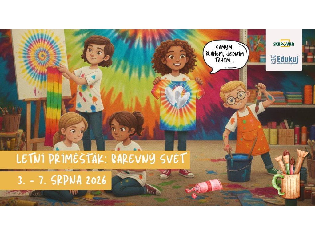 V pohodovém zázemí Skupovky letos opět organizujeme v termínu 3. - 7. srpna 2026 vždy od 7:30 do 16:30 příměstský tábor s tématem „Barevný svět“. Tábor je vhodný pro děti od 6 let. Na programu bude kreativní tvoření, hry, fyzická zdatnost při programu. Samozřejmostí jsou super svačinky, oběd a celodenní pitný režim.